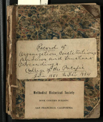 First minute book for the administrative body of the fledgling University of the Pacific, then called the Board of Trustees. This body is now referred to as the Board of Regents.
