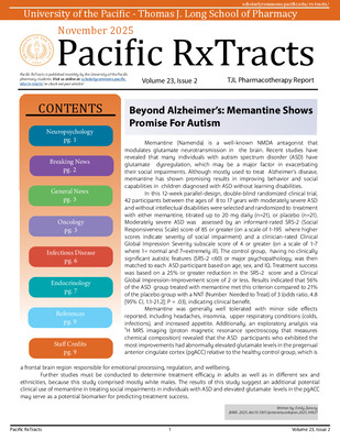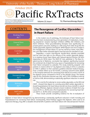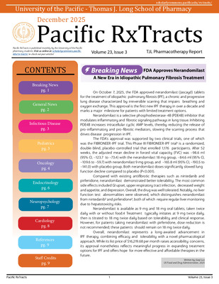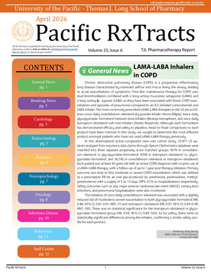 Newsletter published by students of UOP's Thomas J. Long School of Pharmacy and Health Sciences, containing articles on medical studies, drug trials, and other industry-related topics.